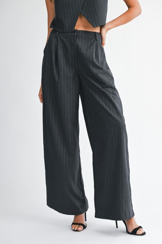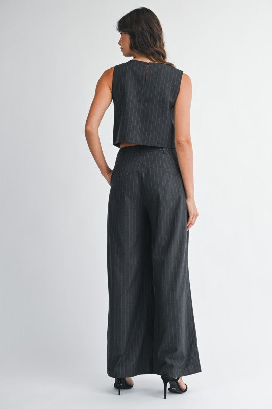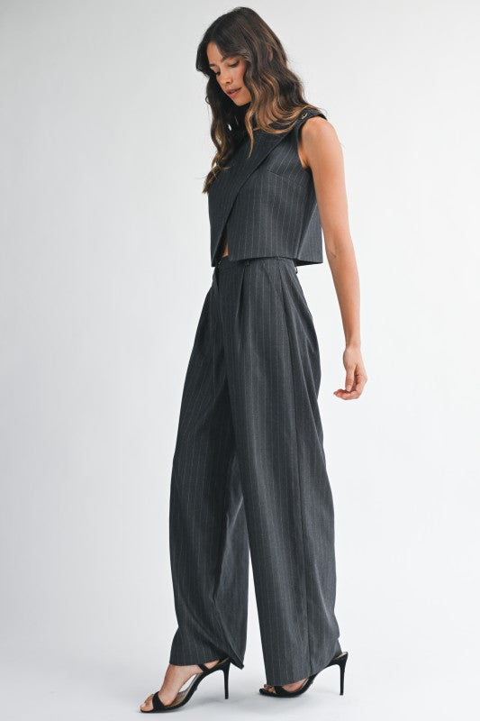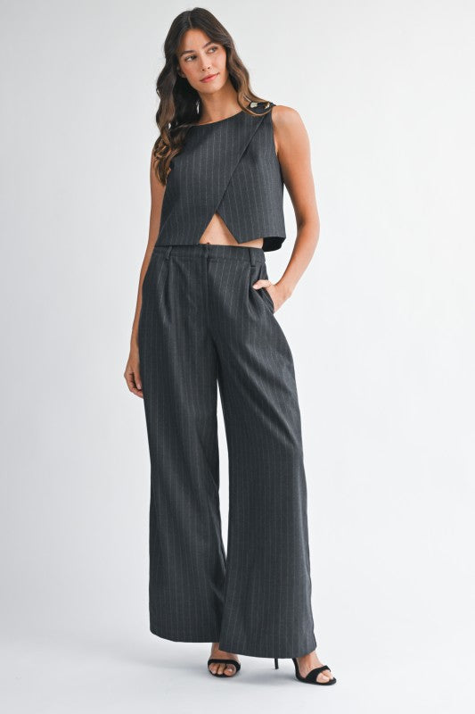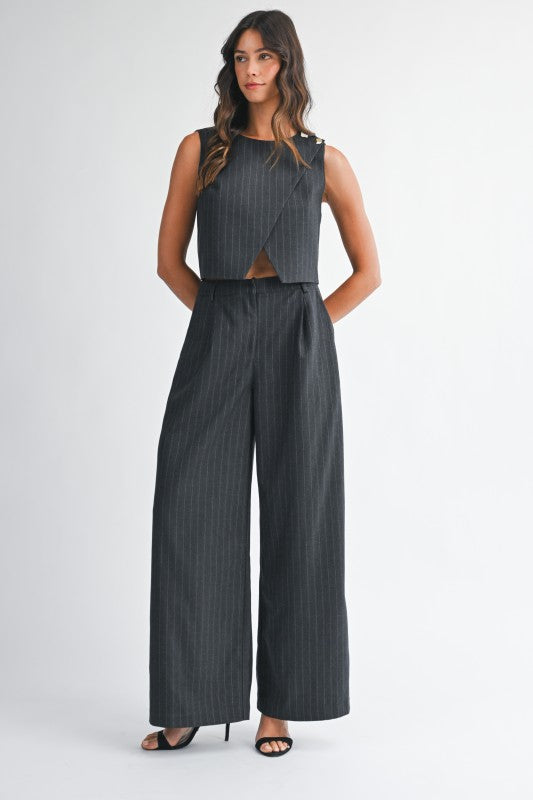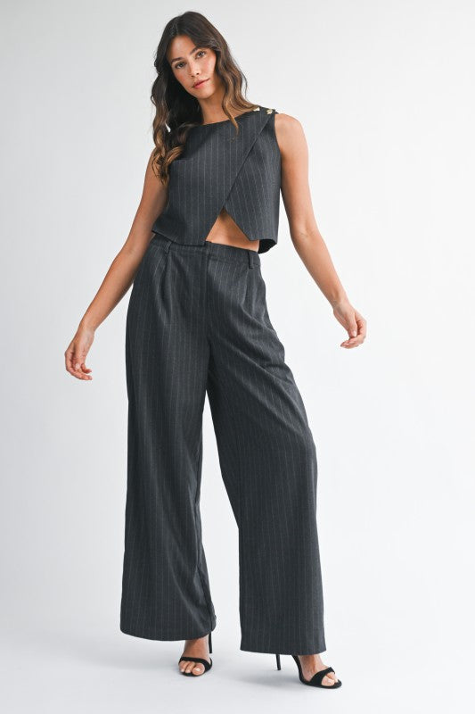 Make a statement with this fun two-piece ensemble that's ready for anything. The pin-striped cropped top flaunts an asymmetric wrap design and dual gold button details at the shoulders for that extra flair. High-waist wide-leg trousers complete the look with a breezy, confident vibe. Fully lined for all-day comfort and movement.