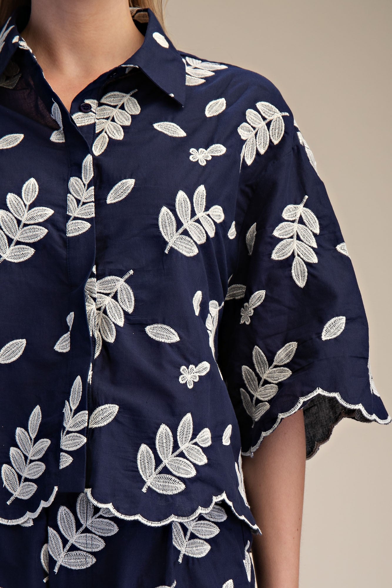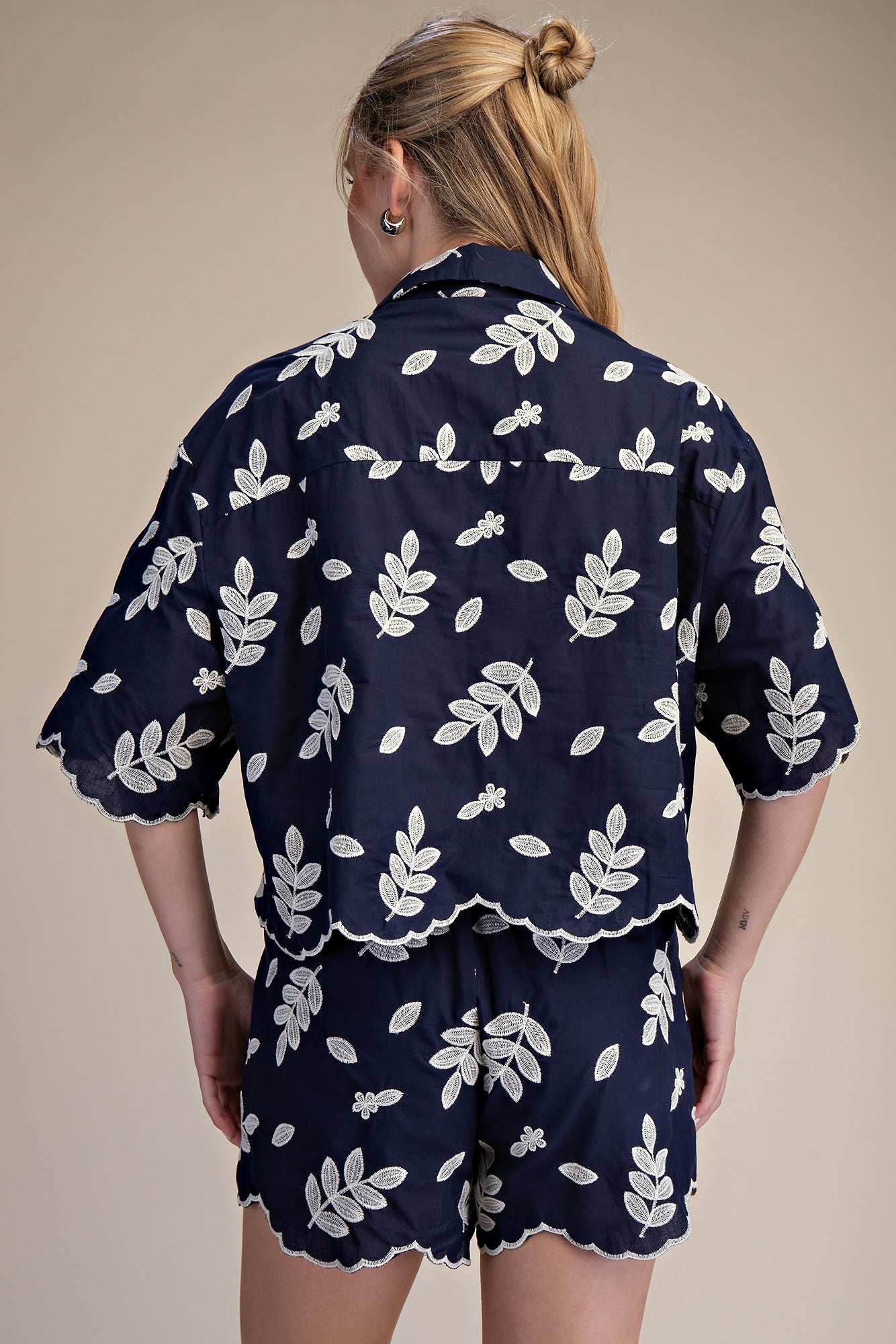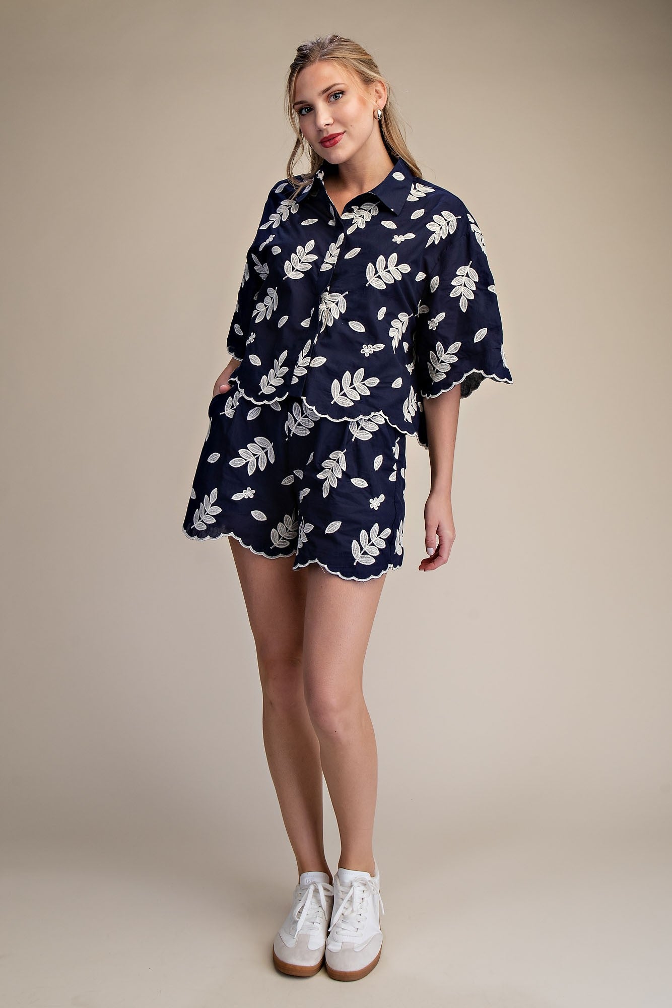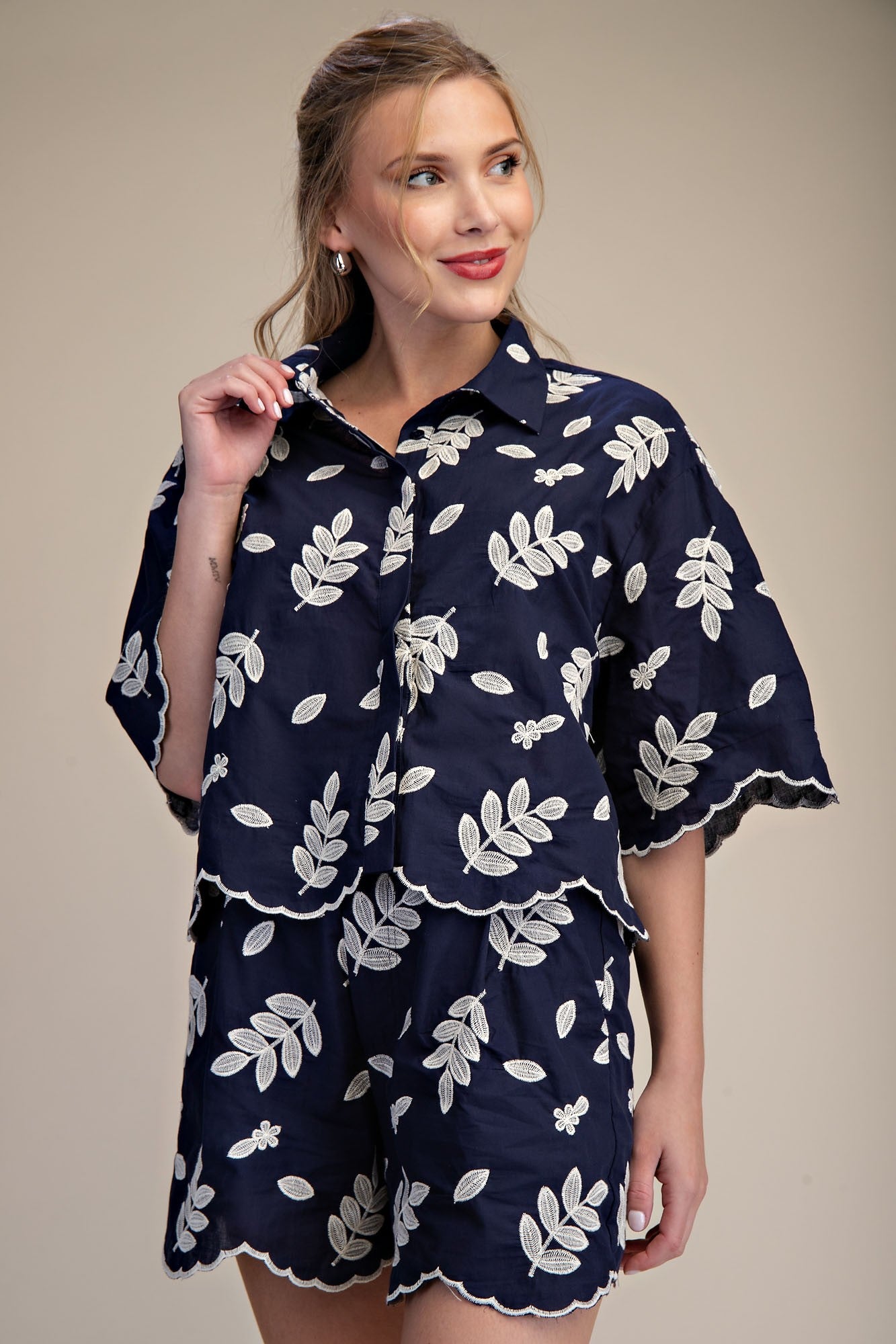 This dynamic duo delivers effortless charm. The eyelet crop shirt pairs a structured collar with delicate cutout details, while the high-waist shorts feature a sweet scallop trim. Styled together, they're a complete statement—wear them as a coordinated set for a polished finish, or separate them to refresh your existing wardrobe. Either way, you've got a versatile combo that works from brunch to evening plans.